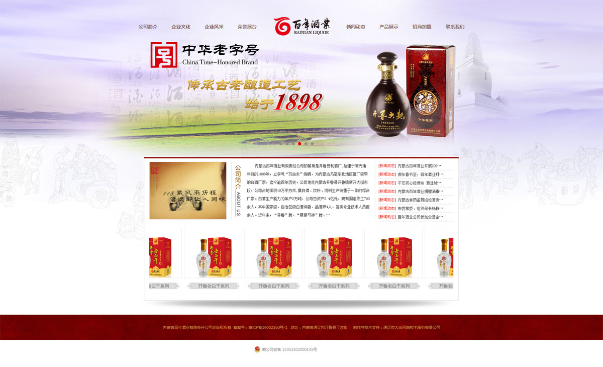 內(nèi)蒙古百年酒業(yè)有限責(zé)任公司的前身是開(kāi)魯制酒廠,始建于1898年的“萬(wàn)合永”燒鍋,迄今已有120多年釀酒歷史。企業(yè)歷經(jīng)了個(gè)體、國(guó)營(yíng)、轉(zhuǎn)制的變革和發(fā)展,現(xiàn)已成為集白酒、木糖、飼料生產(chǎn)銷售于一體的自治區(qū)農(nóng)牧產(chǎn)業(yè)化重點(diǎn)龍頭企業(yè),是通遼域內(nèi)首家榮獲國(guó)家商務(wù)部頒發(fā)的“中華老字號(hào)”企業(yè)。